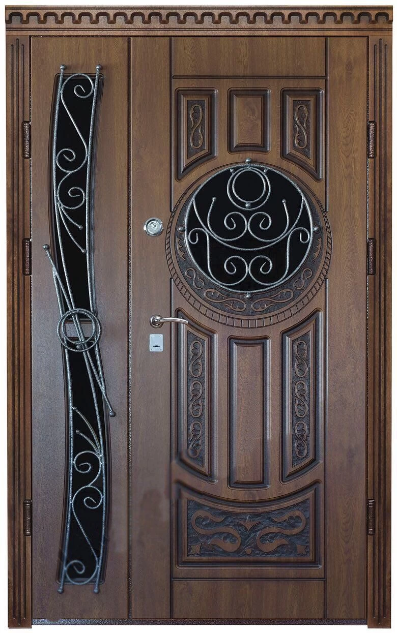 Хорошие атмосферостойкие свойства корабельной фанеры позволяют использовать ее для отделки металлических дверей. Внешне корабельная фанера ничуть не уступает накладкам из массива, но, в отличии от них, более легкая, долговечная, устойчива к перепадам влажности и температуры, не рассыхается, менее подвержена деформации и не имеет так называемого «эффекта памяти», то есть, в отличии от накладок из массива, не старается «вернуться» в исходное положение. По стоимости двери из корабельной фанеры находятся в одном ценовом диапазоне с дверями, сделанными с использованием массива. Ввиду высокой плотности материала, фрезеровка выполняется специальными фрезами, что дает возможность изготовить дверь под любой интерьер и по любому эскизу. А вот вручную нанести фрезеровку на корабельную фанеру не получится – таковы особенности этого материала.